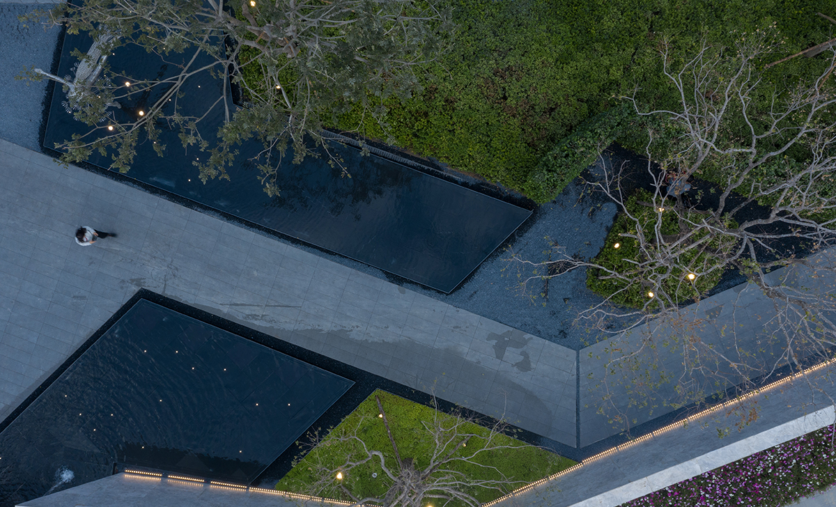 師法自然,致敬土地,從水鄉(xiāng)城中擷取山影、水境、樹聲為景觀靈感, 以“折疊花園”演繹當代城中山水自然庭園,以簡約的造景手法續(xù)寫城市自然景觀形態(tài)。
